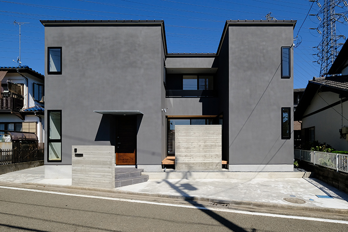 住まい手は、駐車スペースを2台確保することと、玄関や水回りを共有しつつ親子間の距離感の配慮すること、交通量のある南道路からのプライバシーを確保することを望まれました。