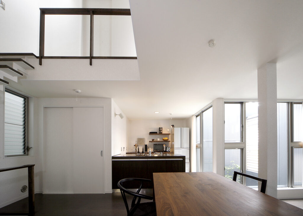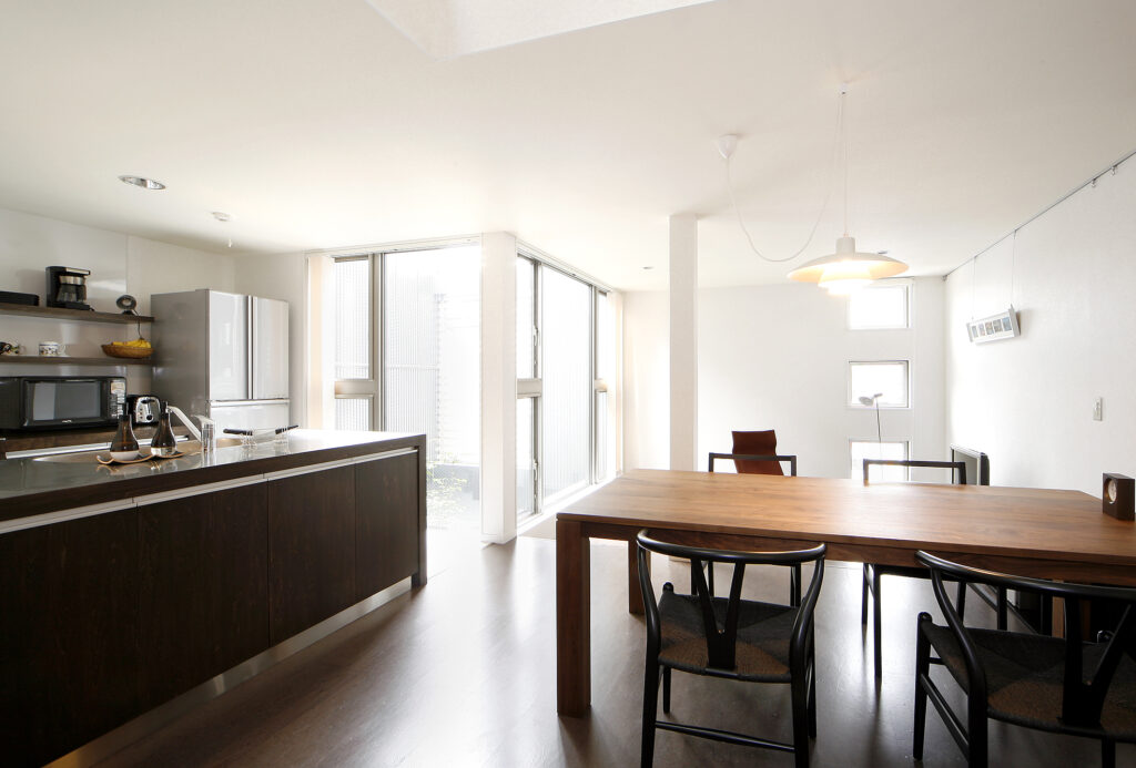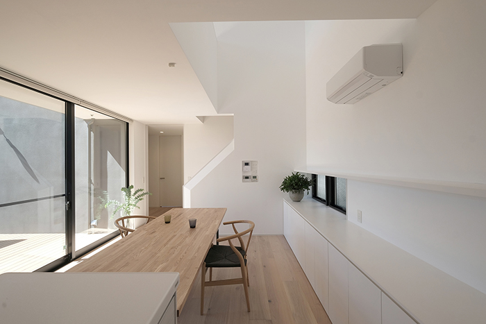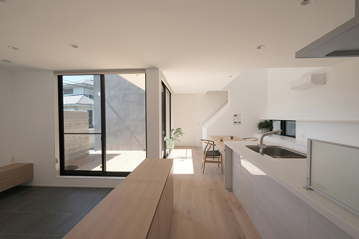 中庭に相反する位置のダイニングの上部を吹抜とし、2階と中庭の両方から光が下り、明るく透明感のある居住空間となっております。 リビングとダイニングと繋がる中庭のデッキは、視覚的な広がりと、日常的に外を感じるスペースになります。